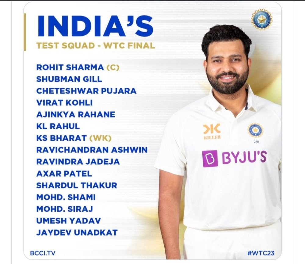 बता दें कि भारत और ऑस्ट्रेलिया के बीच 7-11 जून 2023 से डब्ल्यूटीसी फाइनल लंदन के द ओवल मैदान पर खेला जाएगा। 12 जून रिजर्व-डे रखा गया है। बीसीसीआई ने अपने बयान में कहा, अखिल भारतीय सीनियर चयन समिति ने ऑस्ट्रेलिया के खिलाफ आईसीसी विश्व टेस्ट चैंपियनशिप फाइनल के लिए टीम का चयन किया है।