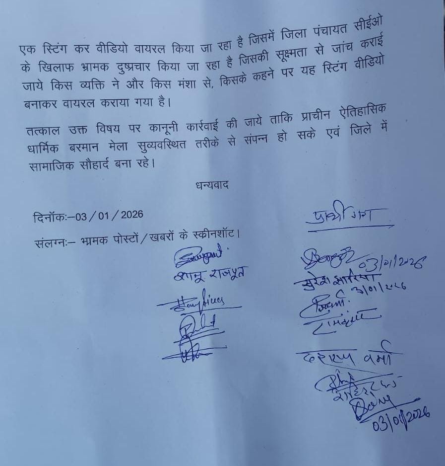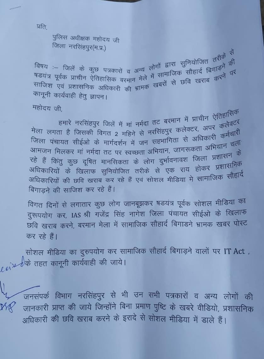 ज्ञापन में उल्लेख किया गया है कि बरमान मेले को सुव्यवस्थित, स्वच्छ एवं शांतिपूर्ण ढंग से संपन्न कराने हेतु विगत दो माह से जिला प्रशासन के मार्गदर्शन में अधिकारी-कर्मचारी एवं जनसहभागिता से निरंतर स्वच्छता एवं जागरूकता अभियान चलाया जा रहा है। इसी बीच कुछ व्यक्तियों द्वारा बिना तथ्यात्मक पुष्टि के सोशल मीडिया पर भ्रामक समाचार, वीडियो एवं टिप्पणियाँ प्रसारित की जा रही हैं, जिससे प्रशासनिक अधिकारियों की छवि प्रभावित होने के साथ-साथ सामाजिक सौहार्द को भी नुकसान पहुँचने की संभावना बन रही है।