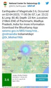 भोपाल।एक बार फिर मध्यप्रदेश में भूकंप के झटके महसूस किये गए। रविवार सुबह 11 बजे पंचमढ़ी और जबलपुर संभाग में इसका असर देखने को मिला है। इस बात की जानकारी नेशनल सेंटर ऑफ सीस्मोलॉजी (National Center For Seismology) ने ट्वीट करके दी है। जबलपुर के कुंडम, चंदिया, पनागर और शाहपुरा के साथ उमरिया के कुछ इलाके भी प्रभावित हुए हैं। जबलपुर से 28 किलोमीटर दूर शाहपुरा के पास जमीन के करीब 23 किलोमीटर नीचे की गहराई में भूकंप का केंद्र बताया जा रहा है।