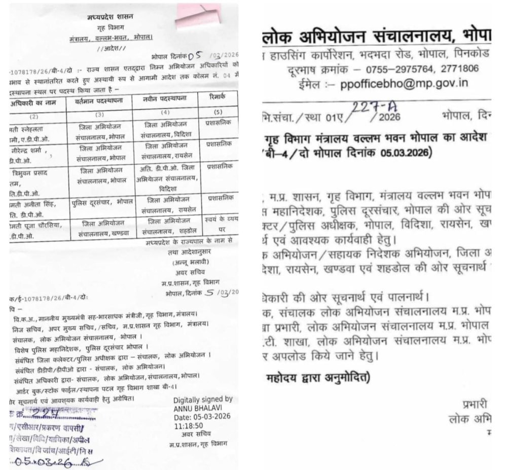 इसी तरह त्रिभुवन प्रसाद गौतम,को जिला अभियोजन संचालनालय भोपाल से अति. डीपीओ जिला अभियोजन संचालनालय विदिशा पदस्थ किया गया है।