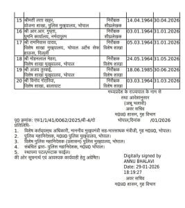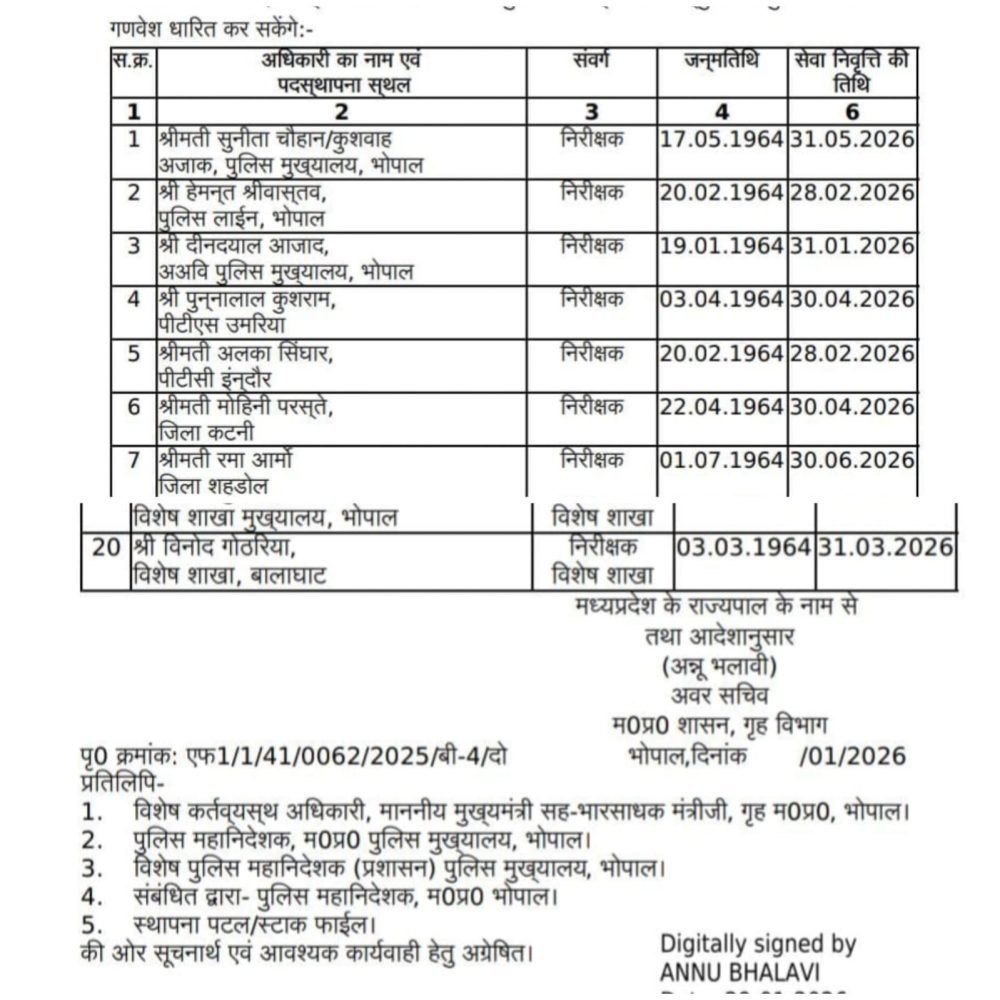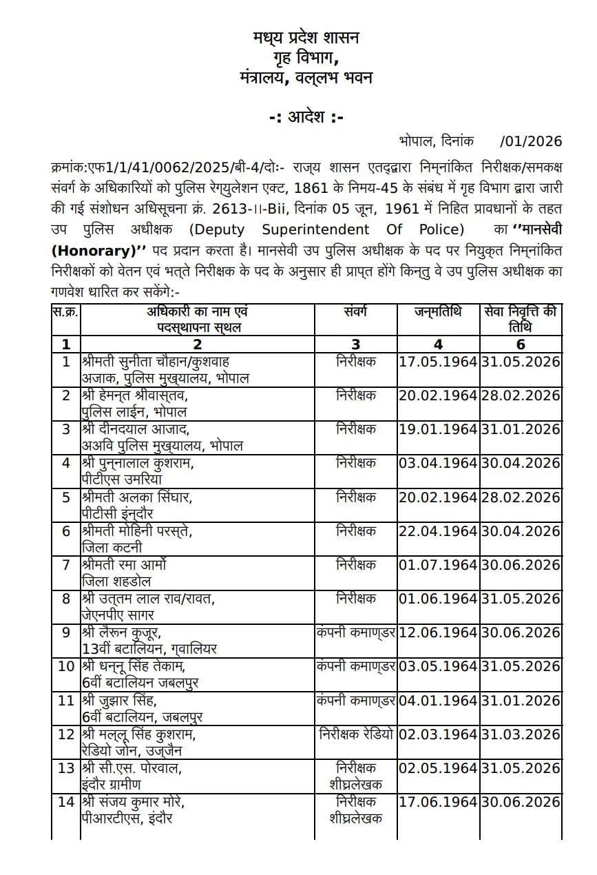 नरसिंहपुर! 30 जनवरी 2026 राज्य पुलिस मुख्यालय द्वारा जारी आदेश के अनुसार सूबेदार (स्टेनो) कैडर के 4 अधिकारियों सहित कुल 20 पुलिस अधिकारियों को उप पुलिस अधीक्षक (डीएसपी) के पद पर पदोन्नत किया गया है।