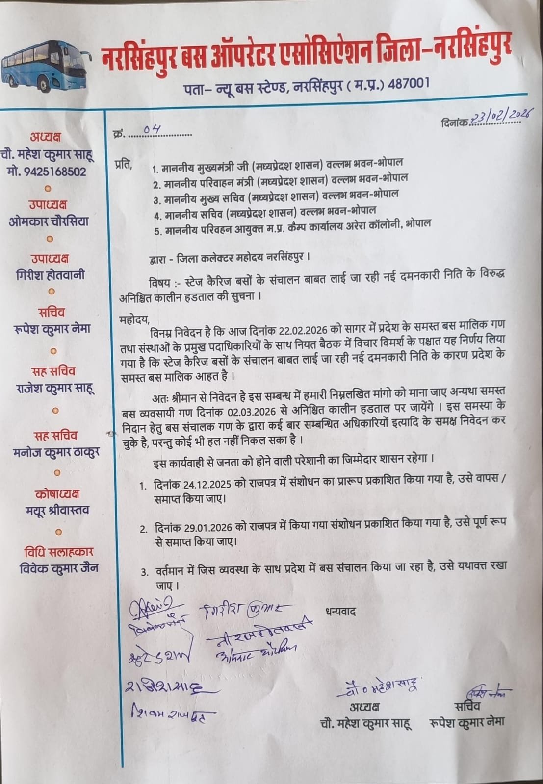 नरसिंहपुर/भोपाल। 24 फरवरी 2026 प्रदेश में प्रस्तावित शासकीय बस संचालन को लेकर जहां निजी बस ऑपरेटर अनिश्चितकालीन हड़ताल की चेतावनी दे रहे हैं, वहीं इस पूरे घटनाक्रम को एक अलग नजरिये से भी देखा जा रहा है। सवाल उठ रहा है कि अगर सरकार शासकीय बसें चलाती है तो इससे आम जनता को राहत ही मिलेगी फिर विरोध किस बात का?