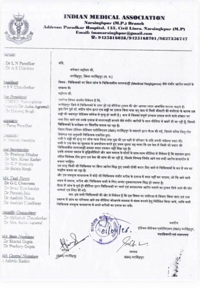 ЁЯЧгя╕П рд╡рд╛рдпрд░рд▓ рдкрддреНрд░ рдореЗрдВ рдХрд▓реЗрдХреНрдЯрд░ рдирд░рд╕рд┐рдВрд╣рдкреБрд░ рдХреЛ рд╕рдВрдмреЛрдзрд┐рдд рдХрд░рддреЗ рд╣реБрдП рдпрд╣ рдЙрд▓реНрд▓реЗрдЦ рдХрд┐рдпрд╛ рдЧрдпрд╛ рд╣реИ рдХрд┐ рдЬрд╛рдВрдЪ рдкреВрд░реНрдг рд╣реЛрдиреЗ рддрдХ рдЗрд╕ рдорд╛рдорд▓реЗ рдореЗрдВ тАЬрдореАрдбрд┐рдпрд╛ рдЯреНрд░рд╛рдпрд▓тАЭ рд╕реЗ рдмрдЪрд╛ рдЬрд╛рдП рдФрд░ рдореАрдбрд┐рдпрд╛ рдХреЛ рд╕рдВрдпрдо рдмрд░рддрдиреЗ рдХреЗ рдирд┐рд░реНрджреЗрд╢ рдЬрд╛рд░реА рдХрд┐рдП рдЬрд╛рдПрдВ, рддрд╛рдХрд┐ рдЪрд┐рдХрд┐рддреНрд╕рдХ рднрдпрдореБрдХреНрдд рд╣реЛрдХрд░ рдХрд╛рд░реНрдп рдХрд░ рд╕рдХреЗрдВред