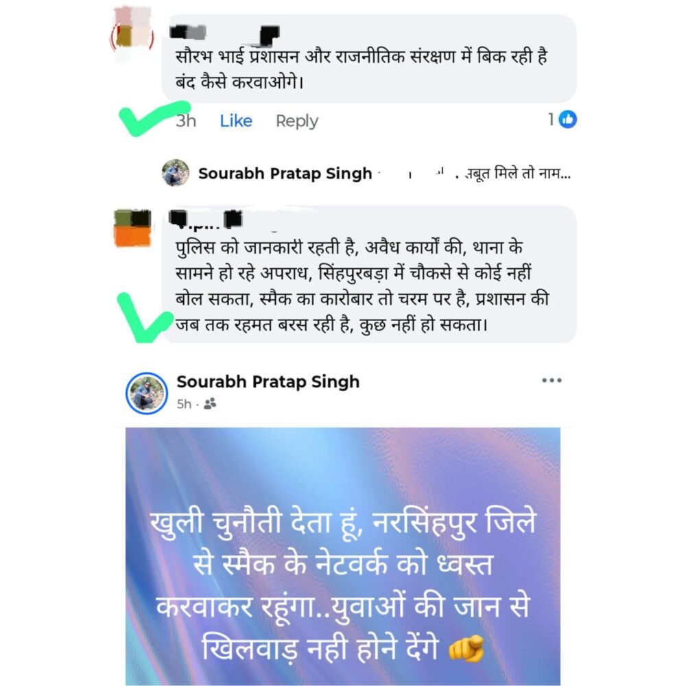рдирд░рд╕рд┐рдВрд╣рдкреБрд░ред┬а 20┬а рдЕрдкреНрд░реИрд▓ 2026┬а рдЬрд┐рд▓реЗ рдореЗрдВ рдирд╢реЗ рдХреЗ рдмрдврд╝рддреЗ рдЬрд╛рд▓ рдХреЛ рд▓реЗрдХрд░ рдЬрдирд╛рдХреНрд░реЛрд╢ рд▓рдЧрд╛рддрд╛рд░ рдмрдврд╝рддрд╛ рдЬрд╛ рд░рд╣рд╛ рд╣реИред рд╕реЛрд╢рд▓ рдореАрдбрд┐рдпрд╛ рдкрд░ рд╕рд╛рдордиреЗ рдЖрдП рд╕рдВрджреЗрд╢реЛрдВ рдФрд░ рдкреНрд░рддрд┐рдХреНрд░рд┐рдпрд╛рдУрдВ рдиреЗ рдХрдИ рдЧрдВрднреАрд░ рд╕рд╡рд╛рд▓ рдЦрдбрд╝реЗ рдХрд░ рджрд┐рдП рд╣реИрдВред рд╕реНрдерд╛рдиреАрдп рд╕реНрддрд░ рдкрд░ рдпрд╣ рдЪрд░реНрдЪрд╛ рддреЗрдЬ рд╣реИ рдХрд┐ рдЖрдЦрд┐рд░ рдХрд┐рди рд▓реЛрдЧреЛрдВ рдХреЗ рд╕рдВрд░рдХреНрд╖рдг рдореЗрдВ рд╕реНрдореИрдХ рдХрд╛ рдЕрд╡реИрдз рдХрд╛рд░реЛрдмрд╛рд░ рд╕рдВрдЪрд╛рд▓рд┐рдд рд╣реЛ рд░рд╣рд╛ рд╣реИ рдФрд░ рдХреНрдпреЛрдВ рдЗрд╕рдХреЗ рдЦрд┐рд▓рд╛рдл рдареЛрд╕ рдПрд╡рдВ рд╕рддрдд рдХрд╛рд░реНрд░рд╡рд╛рдИ рдирд╣реАрдВ рджрд┐рдЦ рд░рд╣реАред