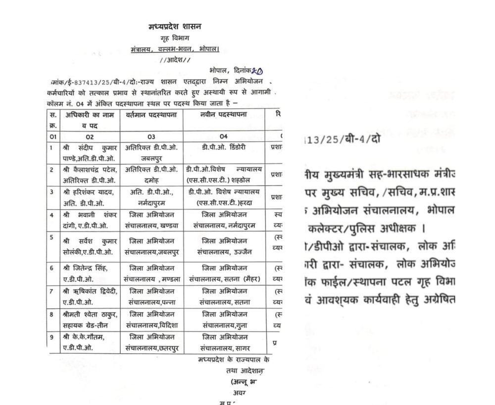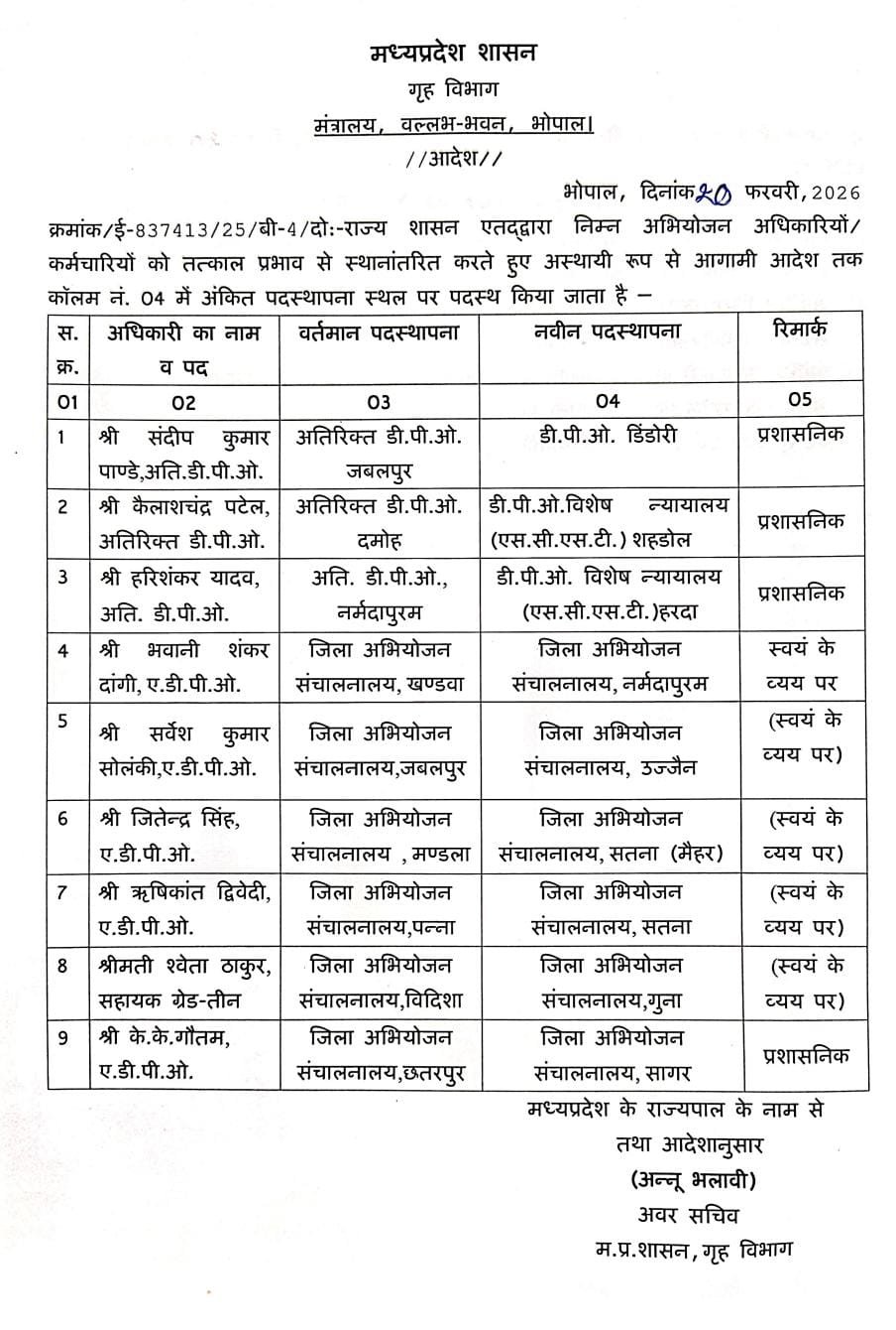 рдордзреНрдпрдкреНрд░рджреЗрд╢ рд╢рд╛рд╕рди рдХреЗ рдЧреГрд╣ рд╡рд┐рднрд╛рдЧ рджреНрд╡рд╛рд░рд╛ рдЕрднрд┐рдпреЛрдЬрди рдЕрдзрд┐рдХрд╛рд░рд┐рдпреЛрдВ рдПрд╡рдВ рдХрд░реНрдордЪрд╛рд░рд┐рдпреЛрдВ рдХреЗ рддрдмрд╛рджрд▓реЛрдВ рдХреЛ рд▓реЗрдХрд░ рдорд╣рддреНрд╡рдкреВрд░реНрдг рдЖрджреЗрд╢ рдЬрд╛рд░реА рдХрд┐рдпрд╛ рдЧрдпрд╛ рд╣реИред рдЖрджреЗрд╢ рдХреЗ рдЕрдиреБрд╕рд╛рд░ 9 рдЕрдзрд┐рдХрд╛рд░рд┐рдпреЛрдВ/рдХрд░реНрдордЪрд╛рд░рд┐рдпреЛрдВ рдХреЛ рддрддреНрдХрд╛рд▓ рдкреНрд░рднрд╛рд╡ рд╕реЗ рд╕реНрдерд╛рдирд╛рдВрддрд░рд┐рдд рдХрд░ рдирд╡реАрди рдкрджрд╕реНрдерд╛рдкрдирд╛ рд╕реНрдерд▓ рдкрд░ рдЕрд╕реНрдерд╛рдпреА рд░реВрдк рд╕реЗ рдЖрдЧрд╛рдореА рдЖрджреЗрд╢ рддрдХ рдкрджрд╕реНрде рдХрд┐рдпрд╛ рдЧрдпрд╛ рд╣реИред