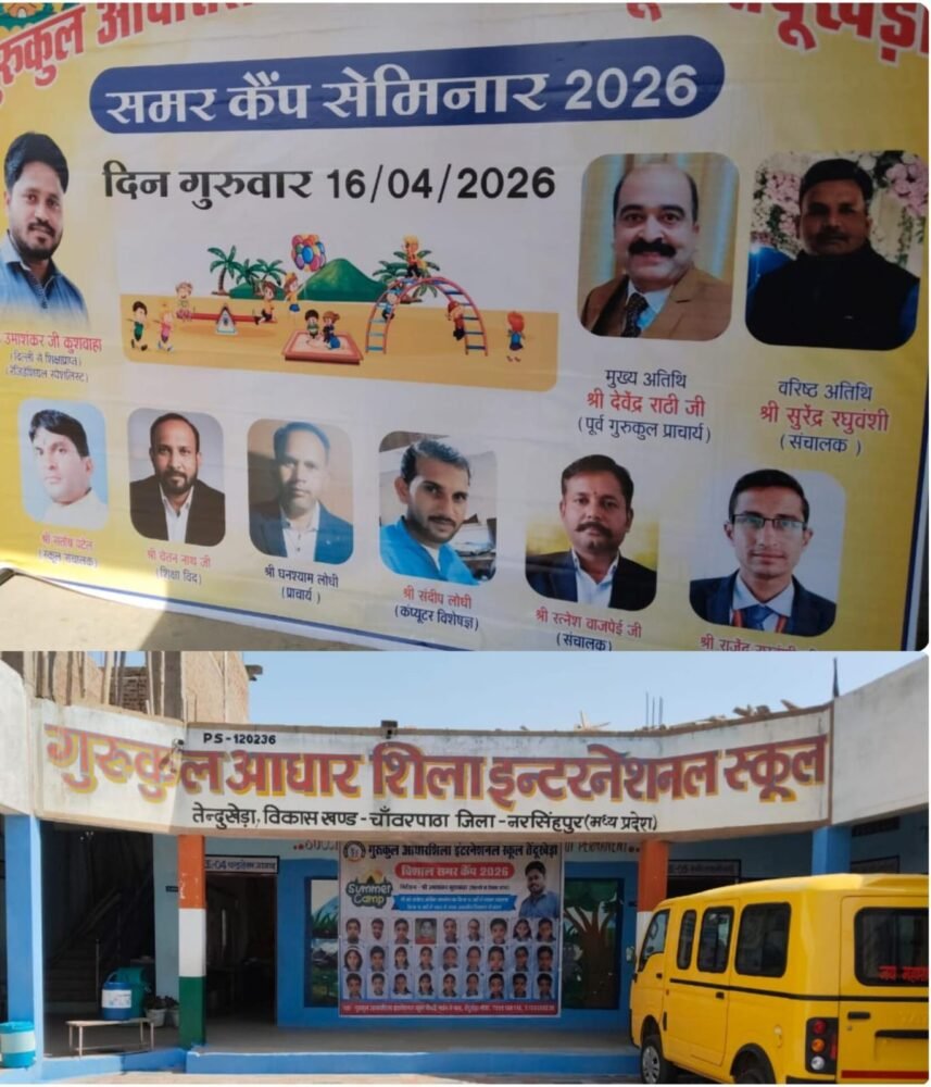 नरसिंहपुर! तेंदूखेड़ा। 15 अप्रैल 2026 गुरुकुल आधारशिला इंटरनेशनल स्कूल द्वारा समर कैंप से पूर्व एक विशाल सेमिनार का आयोजन किया जा रहा है, जिसमें अभिभावकों को रेजिडेंशियल (आवासीय) स्कूलों में बच्चों को मिलने वाली शिक्षा और उनके फायदे के बारे में विस्तार से जानकारी दी जाएगी।